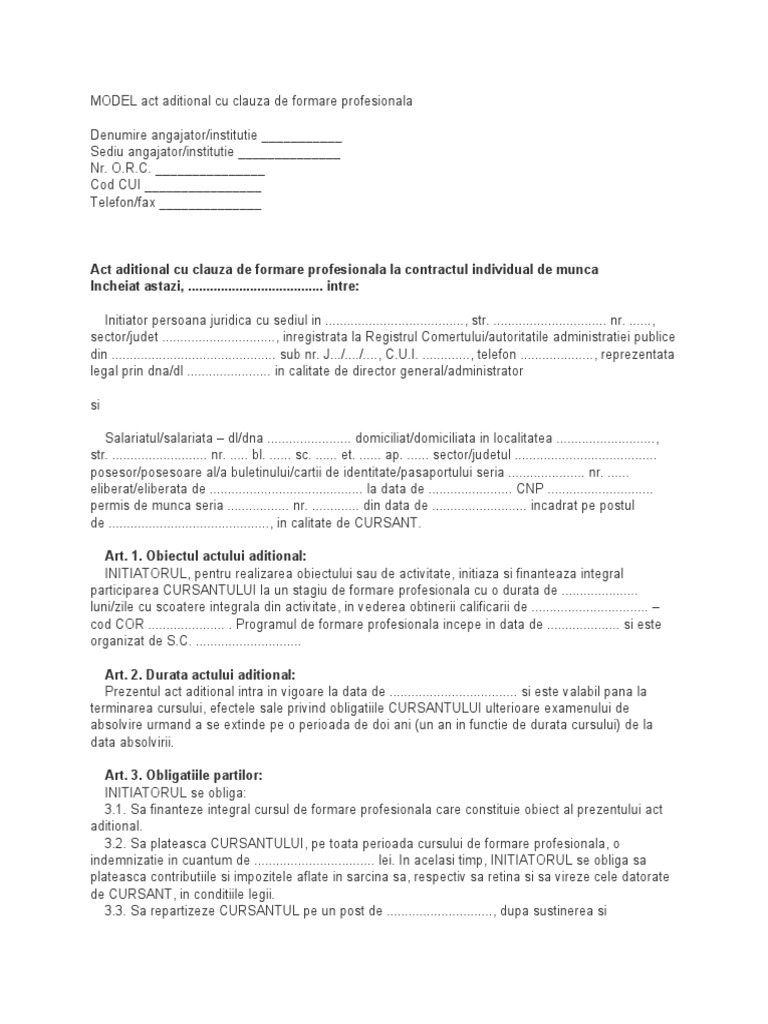 Model act aditional de formare profesionala. Cheltuielile ocazionate de programele de formare profesionala vor ramane in sarcina angajatorului, iar salariatul va beneficia de toate drepturile salariale pe intreaga perioada de. Se modific /completeaz informaiile referitoare la formare profesional (stipulat art, litera) al contractului individual de munc cu urmtoarele prevederi: