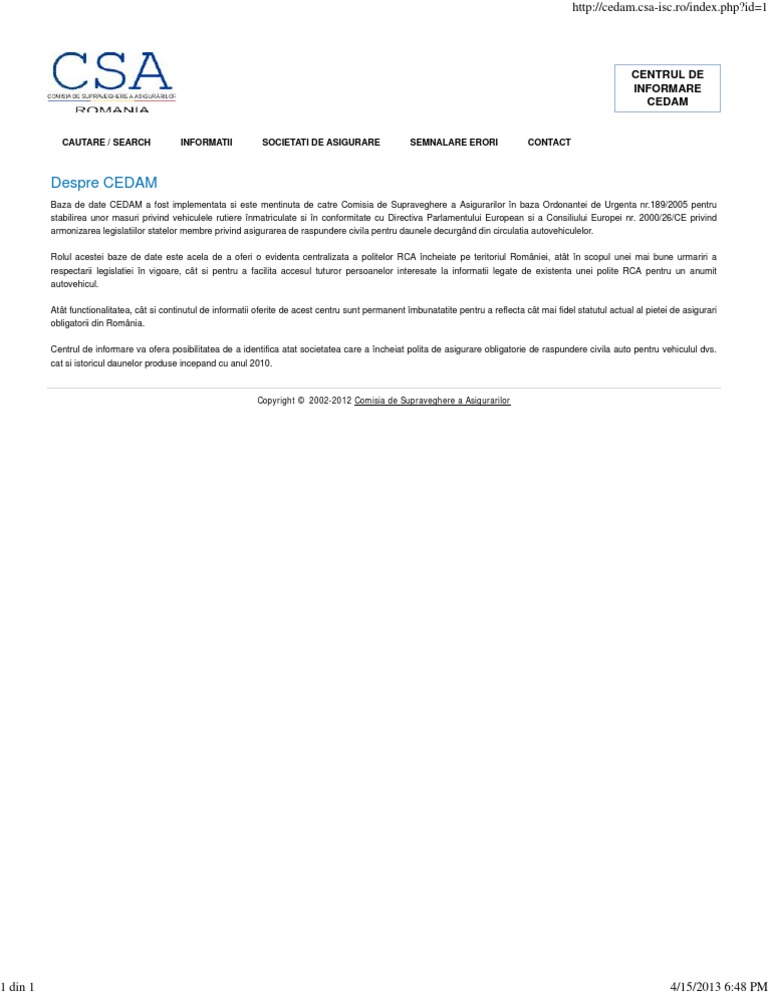 Sistemul cedam a cedat din nou. Serie de caroserie (serie vin) numar de inmatriculare data pentru care se face verificarea. Polita incheiata la alt asigurator.
