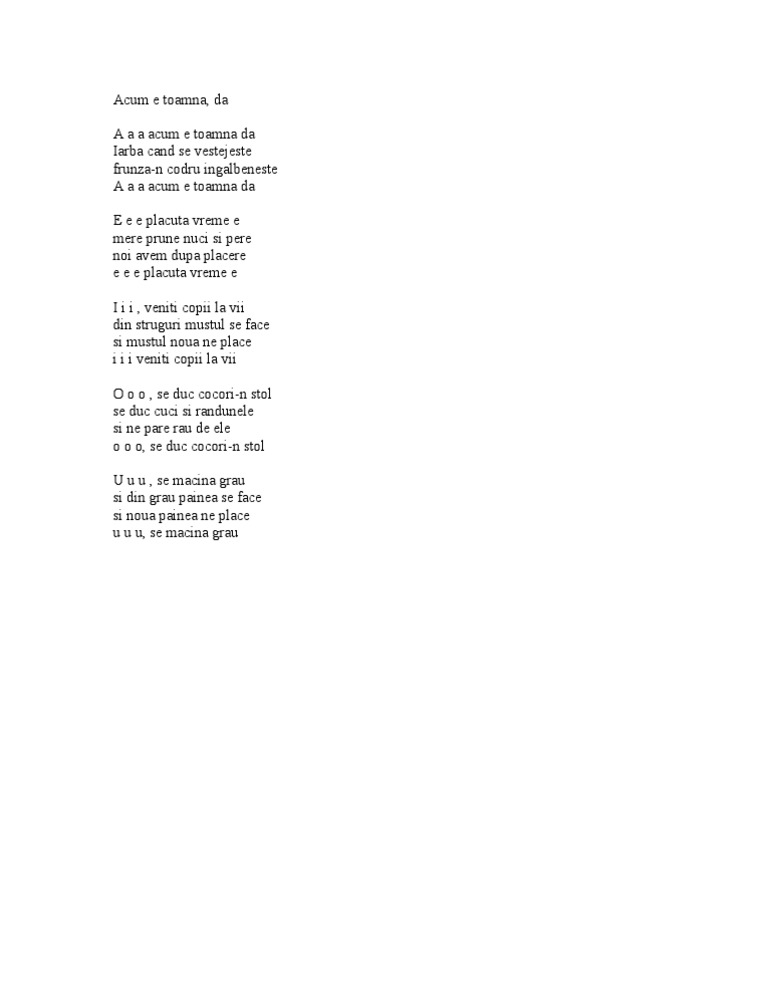 vizitati articolul complet aici : https://de.scribd.com/doc/203190002/A-a-a-Acum-e-Toamna-Da Cântecelul acum e toamnă, da este inclus în colecţia cutiuţa muzicală 8, melodia fiind interpretată de mădălina manole (muzica gr. 00:00 a, a, a, acum e toamnă da 1:34 clopoțelul 3:31 eu voi fi școlar 4:17 cântecel de toamnă 6:57 învățătoarea 9:07 plecarea păsărelelor 10:54 toamna 11:53 anotimpurile 12:54 toamna, toamnă harnică 14:20 culesul viilor 15:32 toamna cea bogată 16:41. A, a, a acum e toamnă da.